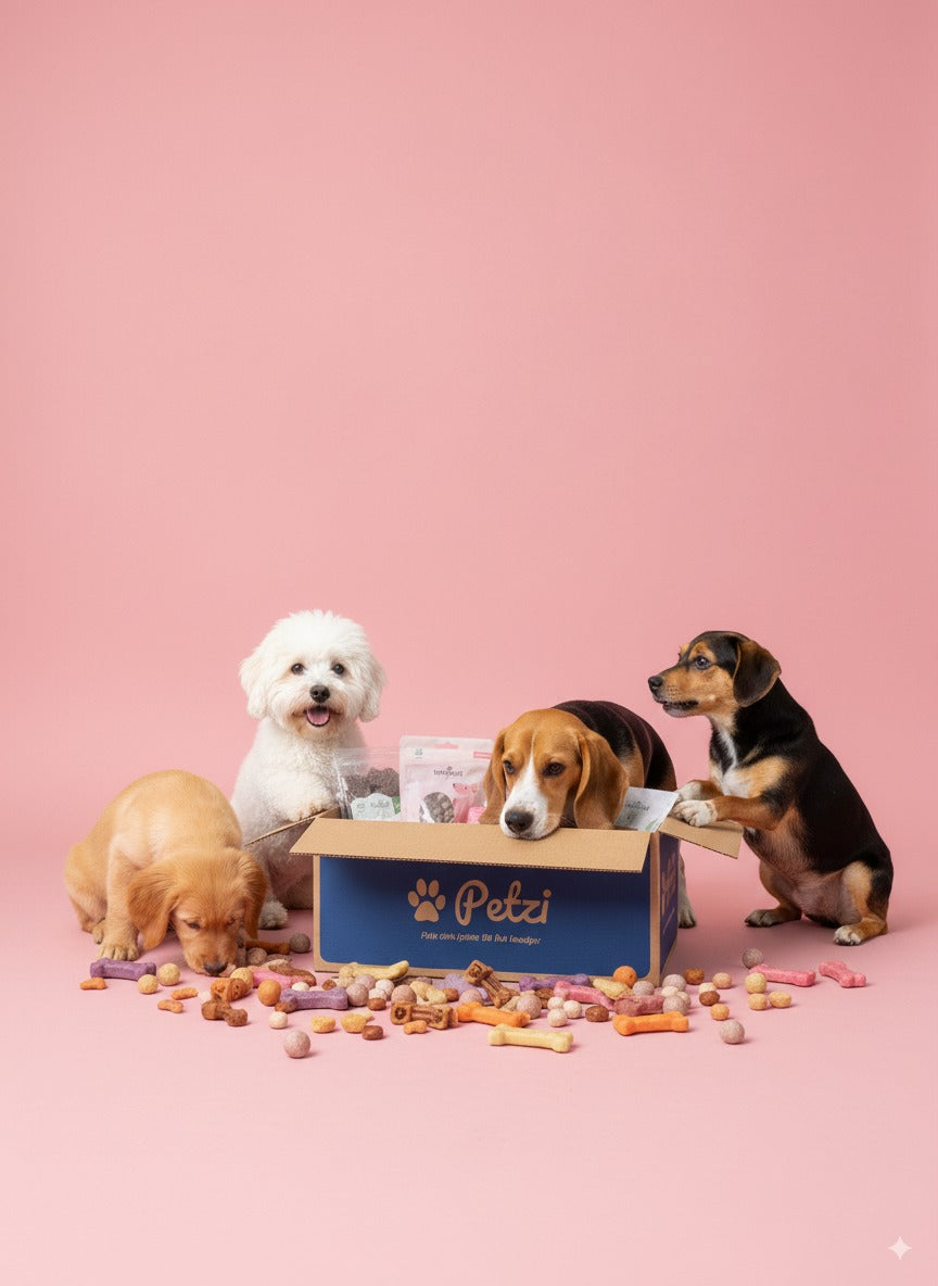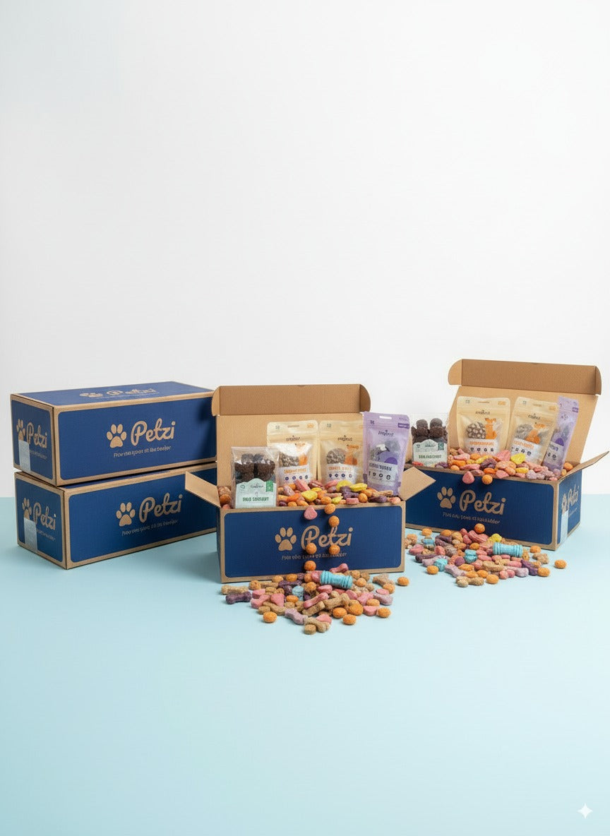 En PetziBox fylld med utvalda godisar, tugg och snacks – levererad hem till dörren varje månad.